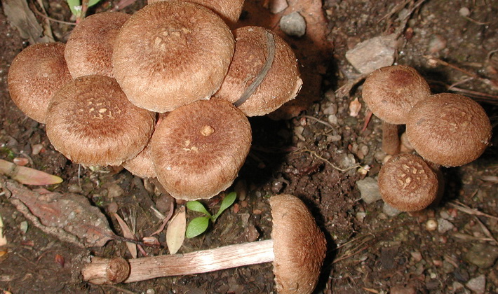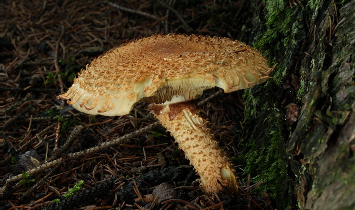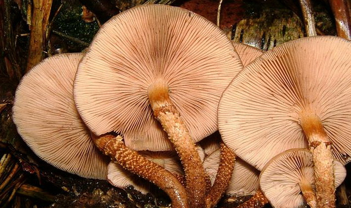 La tige est dense, brune, avec des écailles fibreuses. Les plaques sont larges et adhèrent à la tige, brun brunâtre avec un bord blanc.