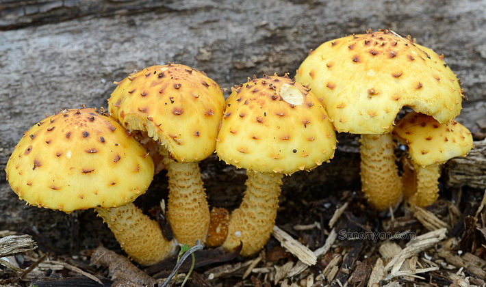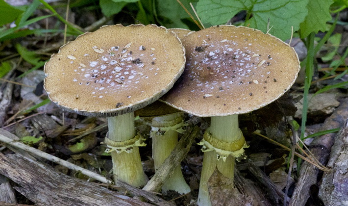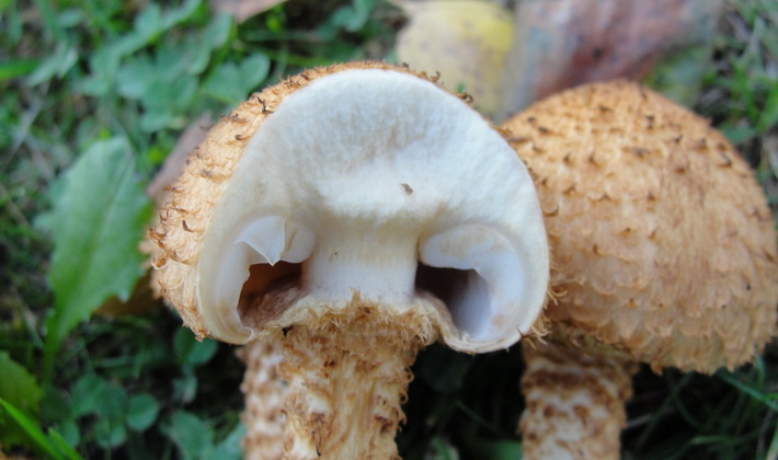 Jambe légèrement rétrécie à la base, jaune pâle, à écailles fibreuses longitudinales, sans rayures, lamelles envahies par la végétation, larges, épaisses, rares, de couleur chapeau.