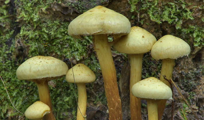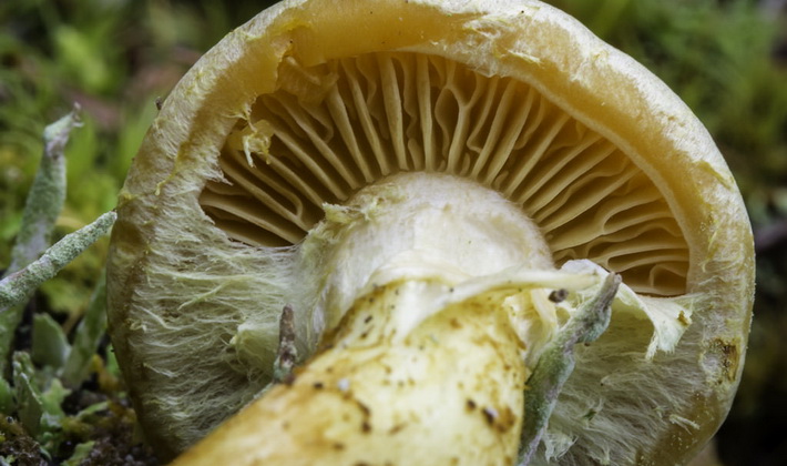 La chair est charnue, blanche ou jaunâtre, les lamelles sont fréquentes, minces, envahies par la végétation, jaunâtres.