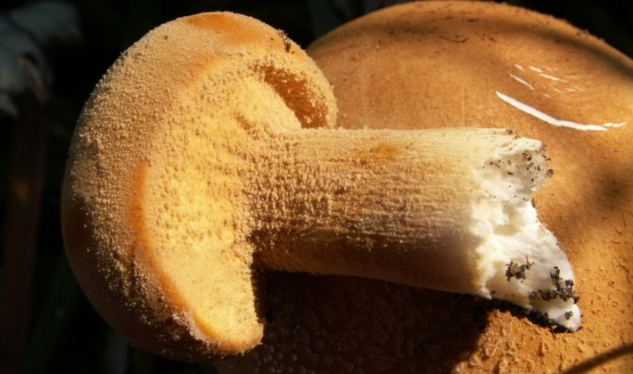 La jambe est en forme de massue, solide, fibreuse longitudinalement, brunâtre.