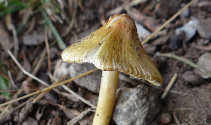 Le chapeau est convexe, étalé d'un tubercule pointu, brillant, blanchâtre au début, puis crème ou ocre, le chapeau de jeunes champignons étant conique, les plaques sont fréquentes, larges, presque libres, grisâtres jaunâtres, puis brun jaunâtres.