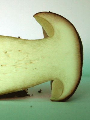 Comme pour les autres cèpes, dont les photos sont présentées sur cette page, la pulpe de chair de pin est dense et charnue, blanche sur la coupe et sent comme la noix grillée.