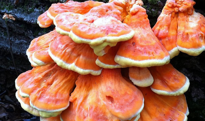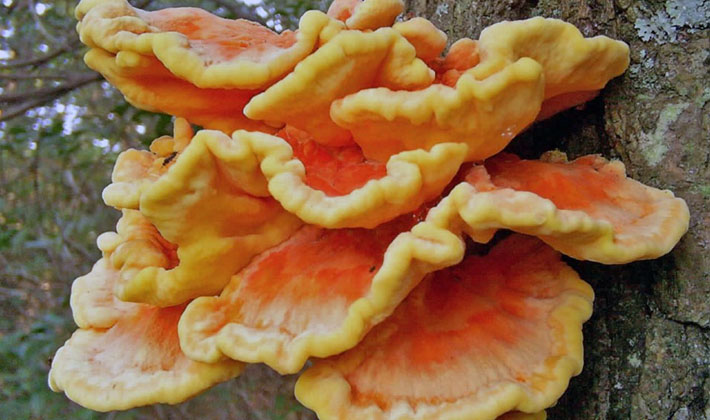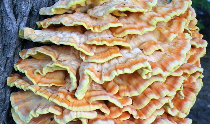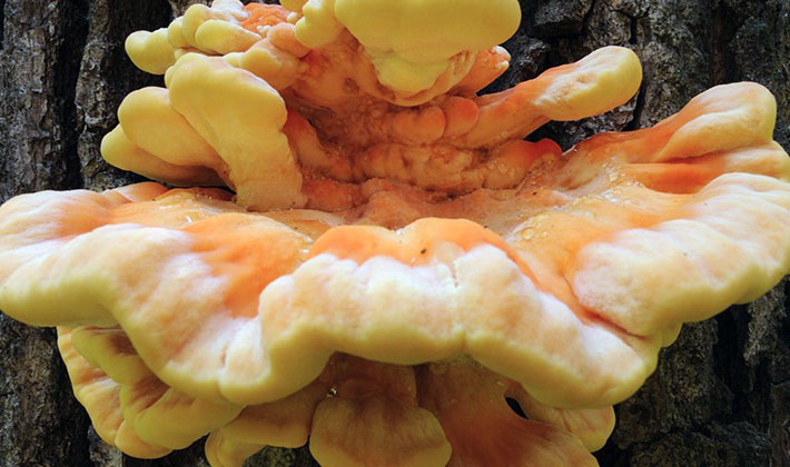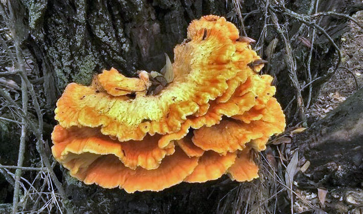 Tuyaux de soufre jaune (Laetiporus sulphureus) - L'un des plus beaux champignons de la saison chaude. Ensuite, ils ressemblent à d’épaisses pétales de rose orangé et jaune vif.À la fin de l'automne, les champignons de boue de cette espèce vieillissent, deviennent gris-crème et sont détruits. En hiver, les restes de ce champignon sont visibles sur les arbres et l’état extérieur dépend de la saison précédant l’apparition du gel - sec ou humide, ainsi que de la période de croissance.