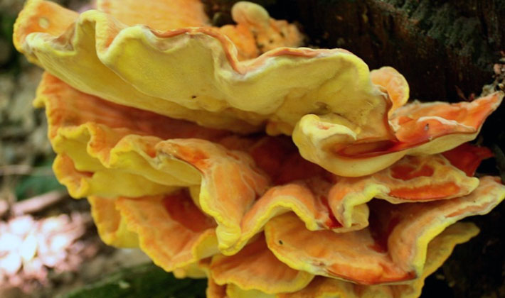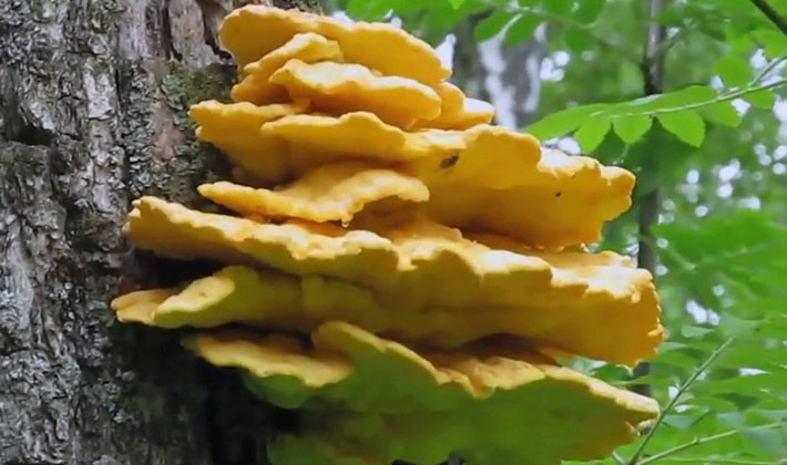 Faites attention à la photo - une caractéristique distinctive de ce type de polypore est la couleur jaune soufre et jaune rose des corps de fruits en forme de pancake ou de pétale: