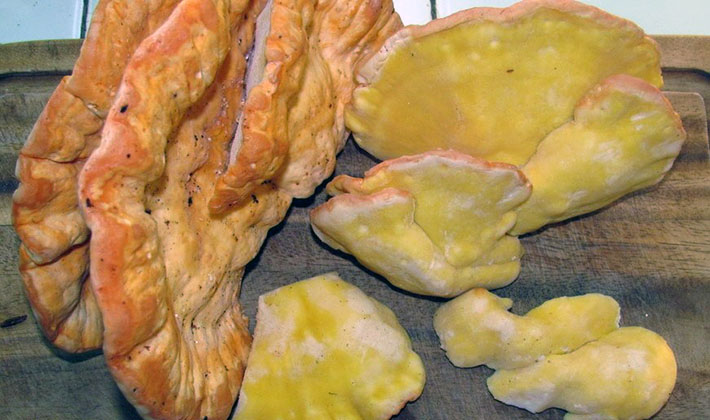 Pulpe: épais, ressemblant à du liège, puis ligneux, d’abord jaune clair, puis marron ou brun. Les tubes sont blanchâtres, puis jaunissent.
