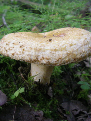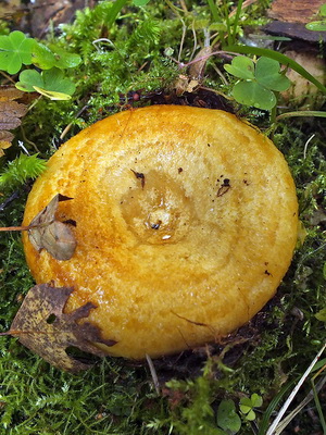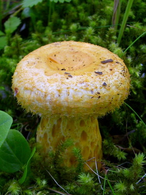 Champignon poitrine jaune (Lactarius scrobiculatus) a un chapeau avec un diamètre de 6-28 cm.Il est généralement jaune, mais peut être brun ou légèrement doré, souvent avec de petites écailles. Chez les jeunes champignons, il a une forme légèrement convexe, puis se redresse progressivement ou devient concave. Les bords sont généralement pliés. Il est lisse au toucher, par temps humide, il peut être muqueux.