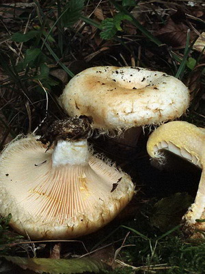 Records: étroit et fréquent, légèrement rosâtre ou jaune, mais plus souvent blanc. Lorsque pressé, des taches brunes se forment sur la surface.