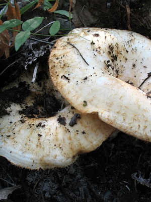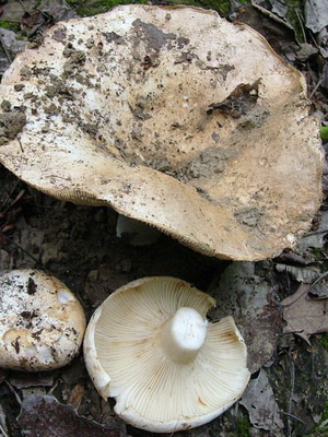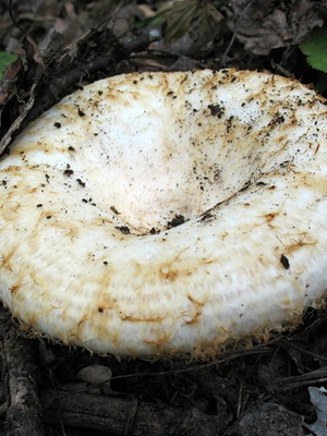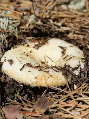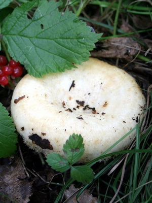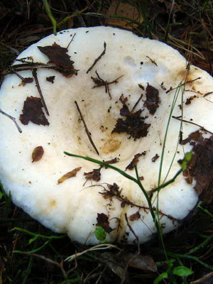 Ci-dessus, vous pouvez voir à quoi ressemble le sein blanc sur la photo. Son chapeau (diamètre 6-25 cm) est blanc ou jaunâtre. Chez les jeunes champignons, il est plat mais finit par prendre la forme d'un entonnoir. Sur les bords courbés à l'intérieur, il y a presque toujours un duvet perceptible. Collant et très humide au toucher.