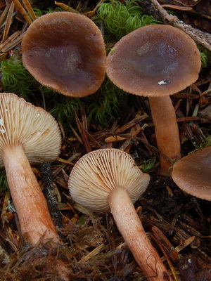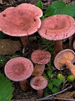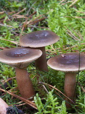 Ci-dessus, une photo de son apparence poitrine amère (Lactarius rufus). Son chapeau a un diamètre de 3-12 cm, généralement brun ou rougeâtre, a la forme d'une cloche, avec le temps se redresse sensiblement, un petit tubercule en forme de cône apparaît au centre. Dans les champignons mûrs, une dépression. Au toucher, il est lisse, avec un peu de pubescence, après la pluie ou par temps humide, il peut être collant et glissant. En règle générale, les bords sont fortement courbés vers l'intérieur et plus clairs que le centre.