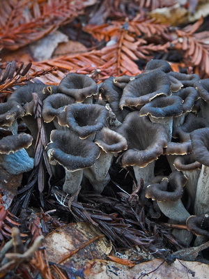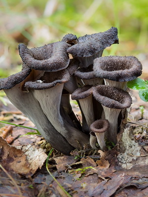 Gris en entonnoir (Craterellus cornucopioides) aussi semblable à l'entonnoir chanterelle. La différence est la couleur terne et beaucoup plus sombre appartenant à l'entonnoir. En outre, ce représentant a un hyménophore lisse.