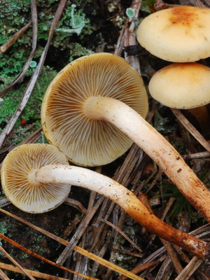 Chapeau: diamètre de 3 à 7 cm, de forme hémisphérique chez les individus jeunes et convexe-ouvert chez les spécimens matures. Souvent, sur les bords du bonnet, il reste des morceaux du couvre-lit. Le chapeau est hygrophane, c’est-à-dire que la couleur dépend complètement de l’humidité de l’air. Par temps sec, le chapeau est jaune terne, plus saturé de couleur au centre. Par temps humide, il devient brun clair avec un milieu brillant. La chair du chapeau est blanchâtre et mince, a une légère odeur d'humidité.