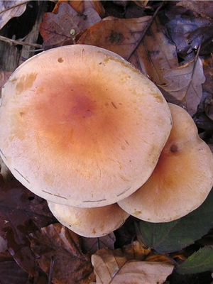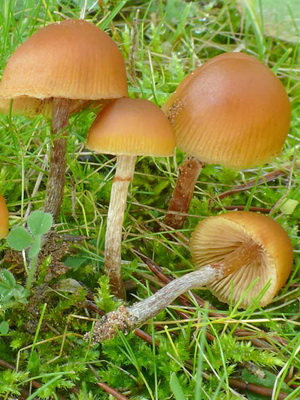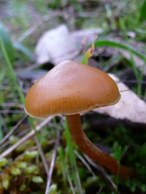 Chapeau (diamètre 3-8 cm): brun ou marron clair, muqueux, dans une forêt humide ou après la pluie, il devient presque transparent. À mesure que le champignon se développe, il passe de convexe à plat. Il a un tubercule caractéristique au centre, qui est plus léger que les bords rainurés.