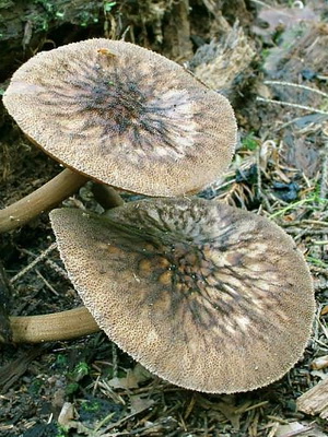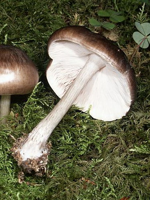 Jambe (hauteur 4-17 cm): généralement blanc ou gris, solide, cylindrique, avec fibres longitudinales, souvent avec un petit motif de maille ou moiré. Peut être gravement courbé et gonflé. Facile à détacher du chapeau.