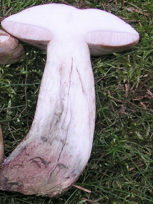 Jambe (hauteur 6-18 cm): crème en bas, blanc en haut, lilas bleuâtre ou clair avec un épaississement visible à la base. Solide, a une forme cylindrique. Souvent avec de petites écailles brunâtres.
