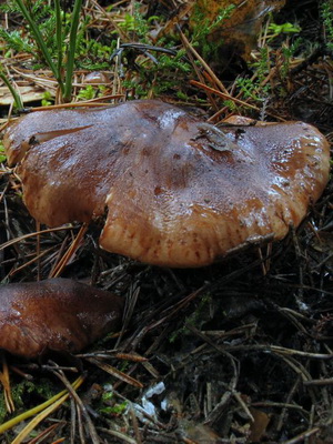 Chapeau: hémisphérique ou convexe, 4-15 cm de diamètre. Avec l’âge, le chapeau s’aligne pour devenir plat, il ya parfois une légère dépression au centre. La surface est lisse, brun-rouge ou jaune-brun, avec un bord côtelé plus clair. Avec l'augmentation de l'humidité, la coiffe du corps fructifiant devient muqueuse.