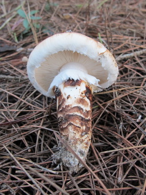 Jambe: grande, peut atteindre 20 cm, épaisse - jusqu'à 2,5 cm, légèrement élargie, souvent inclinée, tombant près du sol, bien qu'elle soit fermement maintenue à la racine. La partie supérieure de la jambe de champignon est chaussée de blanc, puis il y a une jupe en anneau. En dessous de l'anneau, la jambe est de couleur marron avec des taches blanches apparaissant.