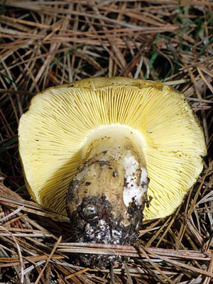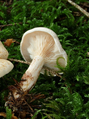 Records: mince, fréquente, étroite, fortement descendante, moins souvent fourchue. Chez les jeunes individus, la couleur des plaques est blanche et, avec l'âge, elles deviennent jaunâtres et même brunes, de petites taches rouillées apparaissent parfois à la surface.
