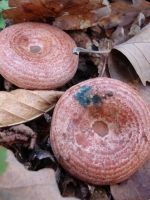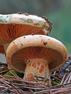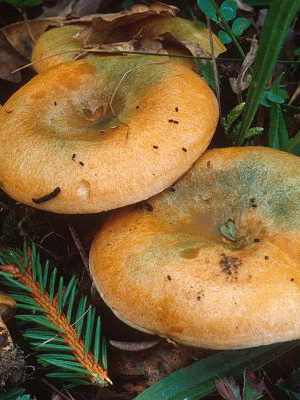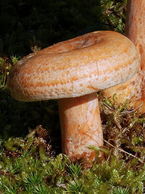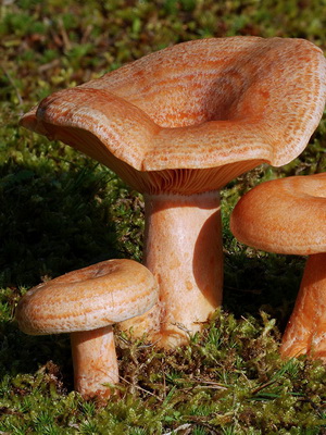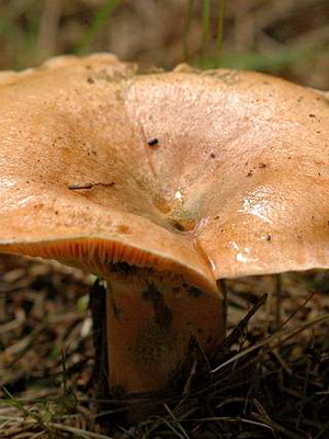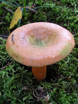 Comme on le voit sur la photo, épicéa cameline (Lactarius deterrimus) a un chapeau orange avec un diamètre de 3-9 cm, avec un petit tubercule au centre. Habituellement légèrement convexe, dans les vieux champignons à teinte verdâtre, il peut être légèrement déprimé ou en forme d’entonnoir. Très fragile, avec des bords légèrement duveteux. Il est lisse au toucher, par temps humide il peut être collant.