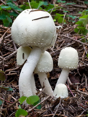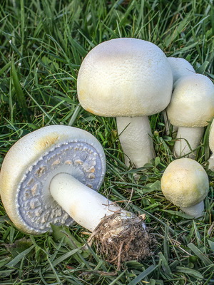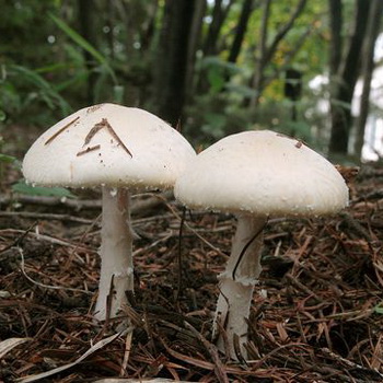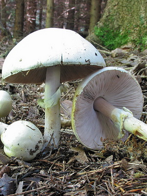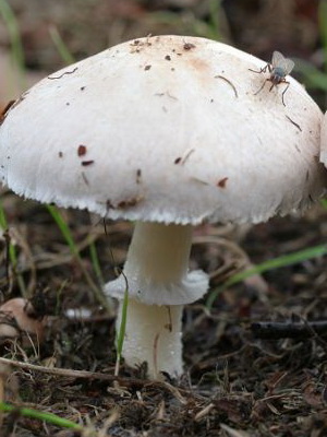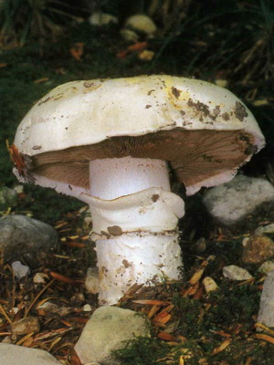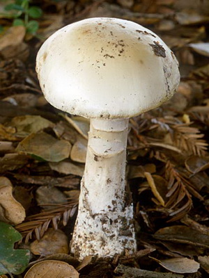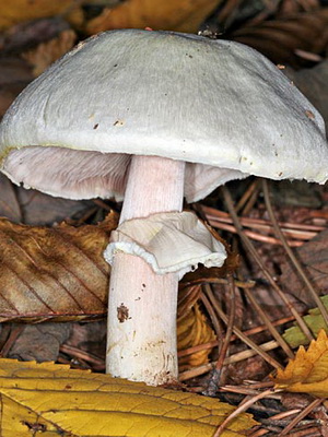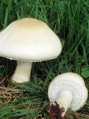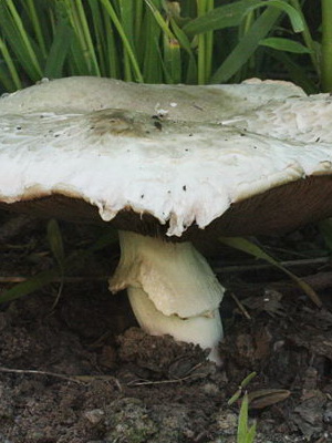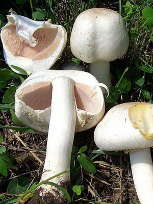 En apparence, le champignon champignon est légèrement différent des autres espèces. Chapeau (diamètre 7-22 cm): blanc, gris, crème ou ocre clair (dans de vieux champignons) avec les restes du couvre-lit. Il a la forme d'un petit œuf ou d'une cloche mais, avec le temps, il se répand presque avec un tubercule visible au centre. Les bords des jeunes champignons sont enveloppés vers l'intérieur et deviennent ensuite ondulés. Par temps sec, ils peuvent très bien se fissurer, ce qui les rend inégaux et déchirés. Le toucher est lisse, dans de rares cas, il peut être avec de petites écailles.Jambe (hauteur 5-12 cm): généralement de la même couleur que le chapeau, vire au jaune pressé, fibreuse, a une forme cylindrique et un grand anneau à deux couches. Souvent effilée de bas en haut. Dans les jeunes champignons, solide, mais devient finalement creux. Facile à détacher du chapeau.
