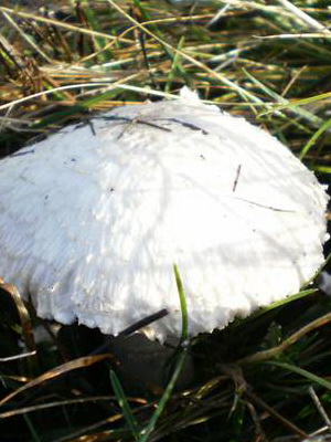 Chapeau Champignon (Agaricus campestris) (diamètre 6-16 cm): blanc ou marron clair, a la forme d'un hémisphère, qui finit par devenir presque ouvert. Au toucher velouté, moins susceptible d'être avec de petites écailles.