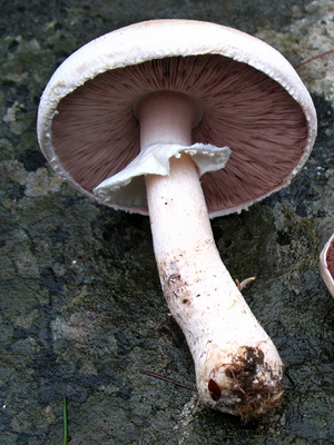 Jambe de champignon à deux anneaux (Agaricus bitorquis) (hauteur 4-12 cm): lisse, blanc, avec un double anneau.