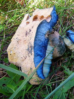 La chair est épaisse, blanche, tourne rapidement au bleu dans la coupe, sans trop de goût ni d'odeur. La couche tubulaire est blanche, puis jaune paille ou ocre crémeux, finement poreuse et vire immédiatement au bleu lorsqu'elle est touchée. Jambe 6-10 X X 1,5-3 cm, tubéreuse, d'abord dense, puis lâche, creuse (ou avec plusieurs grandes cavités), généralement de la même couleur avec un chapeau. Au toucher, il devient bleu.