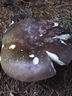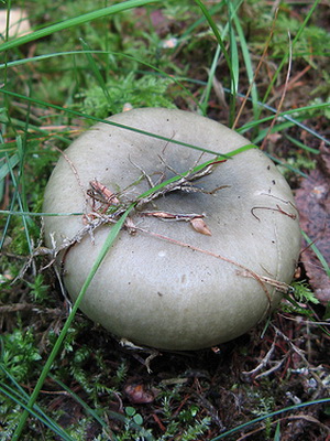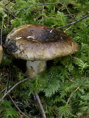 Chapeau de Russula nigricans (diamètre 5-20 cm): généralement marron ou marron. Chez les jeunes champignons, il est convexe et les bords sont courbés vers l’intérieur, tandis que chez les adultes, il est ouvert. Les bords sont plus lumineux que le centre. Collant au toucher, donc souvent avec de petites branches ou des feuilles.