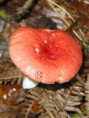 Chapeau de nourriture Russula (Russula vesca) (diamètre 4-12 cm): mat, rose-rouge, brique ou brun-rouge. Chez les jeunes champignons, hémisphérique, il devient avec le temps presque plat. Au toucher par temps humide un peu collant. Les bords sont courbés vers l'intérieur, parfois ondulés et nervurés. La peau ne recouvre pas complètement la chair, ce qui expose les plaques le long des bords, elle est facilement éliminée uniquement des bords.