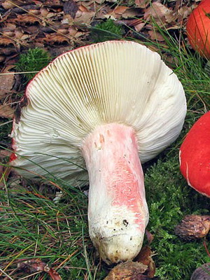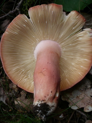 Comme on peut le voir sur la photo, la Russula est rose, ses plaques poussent de manière dense jusqu'à la tige, ont une couleur crème ou marron clair.