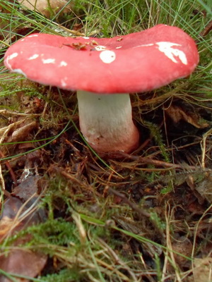 Selon la description, les champignons Russula entiers peuvent être confondus avec le vert-rouge (Russula alutacea). Cependant, la Russula vert-rouge est beaucoup plus grande et possède des plaques de crème bien attachées à la tige.