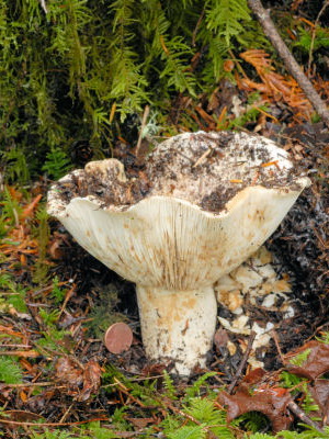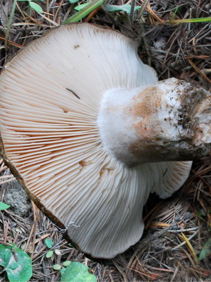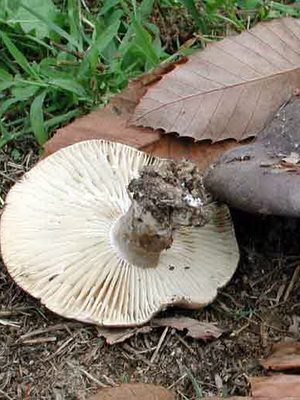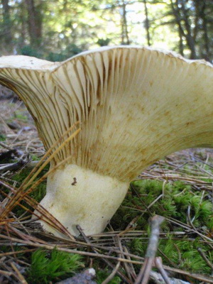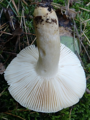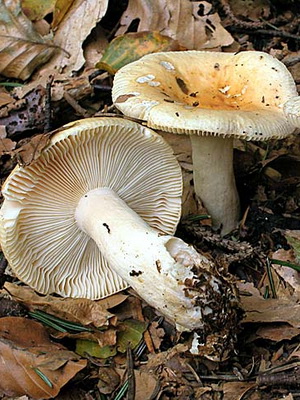 Les plaques de cette espèce de champignons Russula sont très fréquentes, blanches ou jaunâtres, parfois avec des taches rouillées.