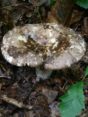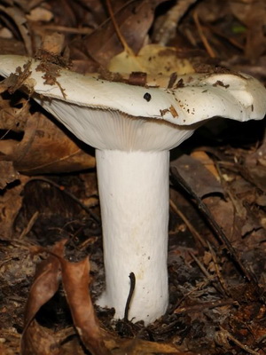 Chapeau Russula à pattes courtes (Russula brevipes) (diamètre 7-22 cm): mat, blanc, parfois fissuré et avec des taches jaunâtres. Dans les champignons adultes, plats ou en retrait.