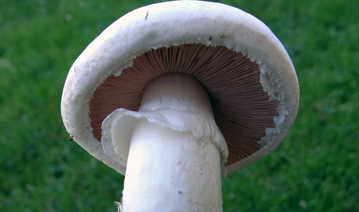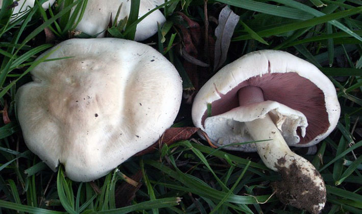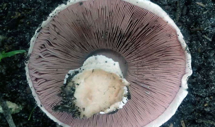 Comme vous pouvez le voir sur la photo, cette variété de champignons a des lamelles fréquentes, leur couleur change du rose pâle au brun avec une teinte pourpre au fur et à mesure de leur croissance:
