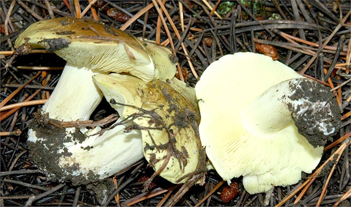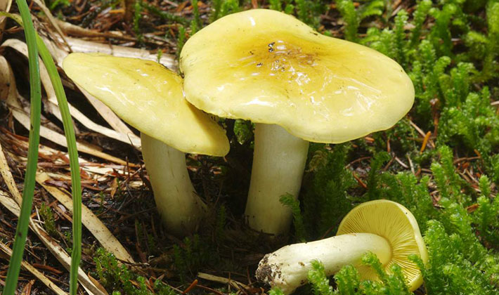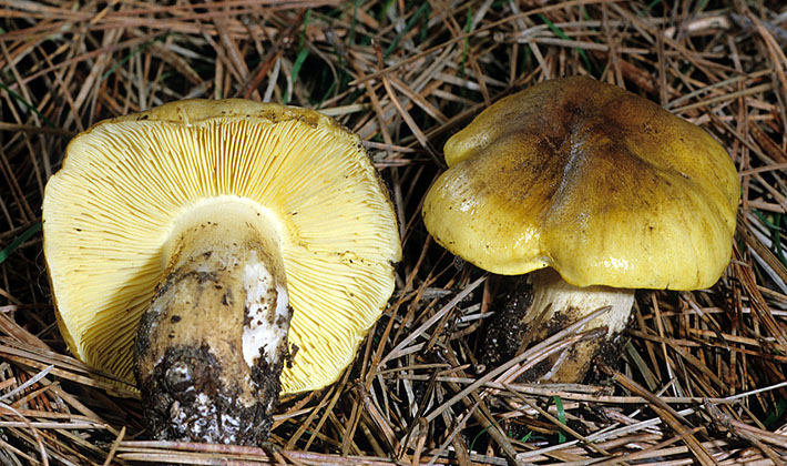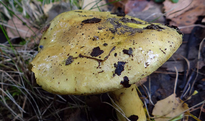 Chapeau: Il a un corps fort et dense, qui n'est pratiquement pas gâté par les vers. Une photo du champignon de serre montre que le capuchon est charnu et convexe au début. Plus tard, il devient ouvert et presque plat, se fissurant souvent de manière radiale. Diamètre de 3 à 15 cm, avec une teinte vert vif ou vert-jaune. Le centre du chapeau est de couleur plus foncée et couvert de petites écailles. Par temps humide, le chapeau devient glissant et collant, ce qui permet d’y coller du sable, des feuilles et de l’herbe.
