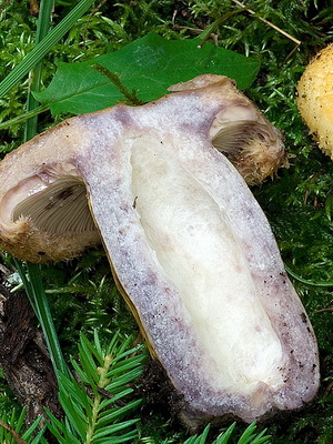 Chapeau de bosse bleue (Lactarius repraesentaneus) (diamètre 5-15 cm): généralement de couleur jaune, qui devient lilas ou bleu au site de pression, ce qui lui a valu son nom. Chez les jeunes champignons, il est légèrement convexe et, avec le temps, il devient plus ouvert ou légèrement déprimé.Les bords pubescents sont pliés à l'intérieur. Au toucher par temps humide, la membrane muqueuse.