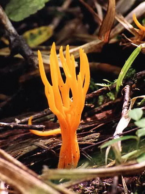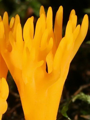 Description Corps du fruit de 2 à 8 cm de hauteur, touffu, légèrement ramifié. Les «cornes de cerf» des champignons à cornes sont un peu collantes, comme si elles brillaient de l'intérieur. La pulpe de calotser est résiliente, gélatineuse, caoutchouteuse, rougeâtre, sans goût ni odeur particuliers.