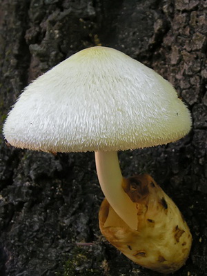 Chapeau sylvain de volvarille (Volvariella bombycina) (diamètre 6-22 cm): fibreuse, blanche ou jaunâtre, en forme de cône ou de cloche, parfois avec des tubercules sur toute la surface. Au toucher soyeux.