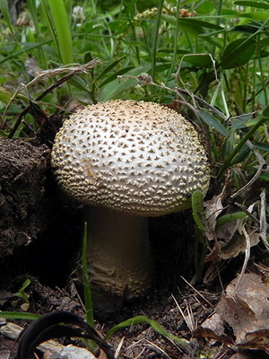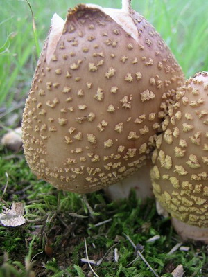Chapeau agaric de mouche (Amanita echinocephala) (diamètre 5-16 cm) blanc, souvent avec une teinte ocre ou verdâtre. Il est charnu, rond et ressemble à un petit œuf de poule, mais avec le temps, il se redresse et devient prostré. Il est couvert d'écailles pyramidales prononcées, pour lesquelles, en passant, le champignon a été nommé hérissé. Sur les bords de la casquette, vous pouvez souvent voir une grande quantité de résidus de couvre-lit.