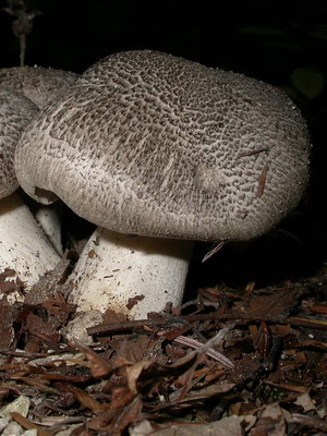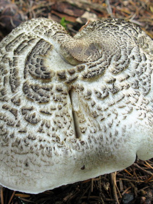 Chapeau d'un rang de tigre (Tricholoma pardinum) (diamètre 5-14 cm): Le blanc grisâtre ou sale, sous la forme d'un hémisphère ou d'une cloche, devient avec le temps plus répandu. Les bords sont très fins et recourbés. Il existe des flocons feuilletés concentriques caractéristiques dont la couleur est beaucoup plus foncée que le reste de la peau du champignon.