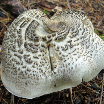 Chapeau: diamètre de 4 à 10 cm, parfois jusqu'à 12 cm Chez les jeunes spécimens, la forme du chapeau est sphérique, devient plus convexe avec l'âge, et chez les sujets plus âgés, elle est complètement étendue, avec des bords minces recourbés, la surface entière du capuchon se fissurant. Les couleurs vont du blanc cassé au bleu-argenté. La surface de la coiffe est parsemée d'éclats d'écailles qui divergent en cercles. Une photo d'un patch de tigre ou de léopard aidera à représenter plus clairement les différences et les similitudes du champignon avec d'autres espèces.